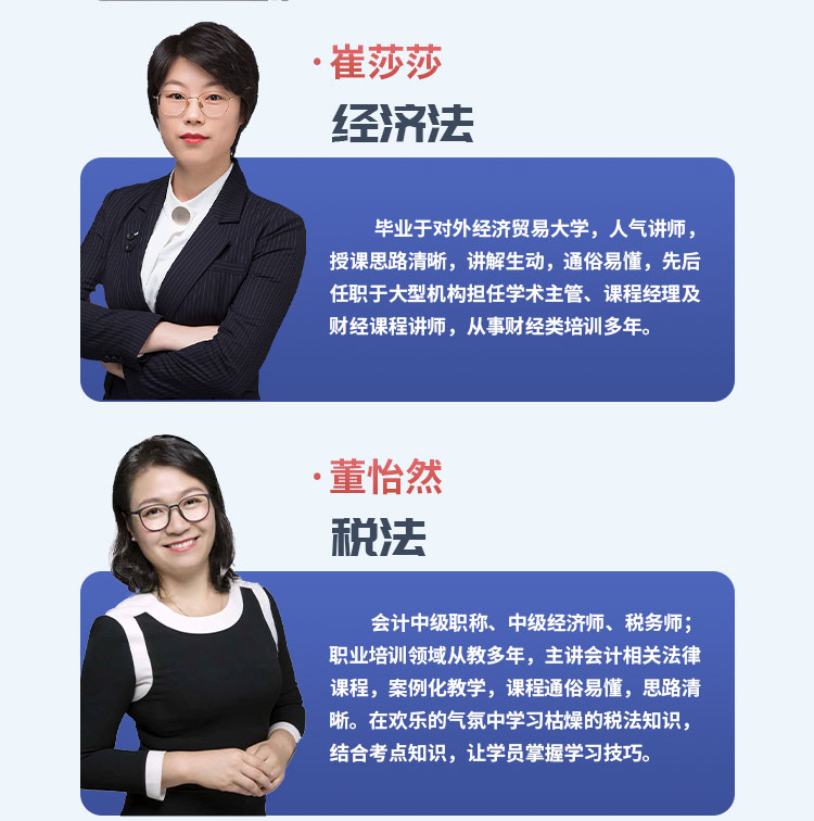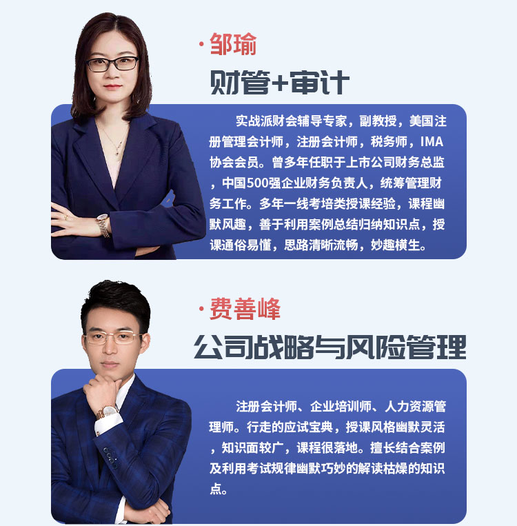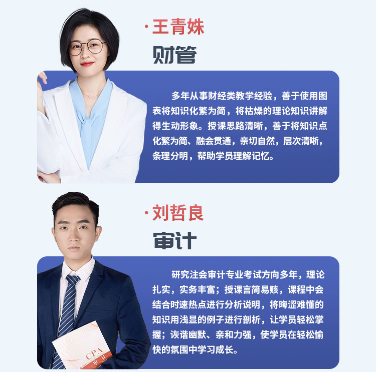 注册会计师、企业培训师、人力资源管理师。行走的应试宝典,授课风格幽默灵活,知识面较广,课程很落地。擅长结合案例及利用考试规律幽默巧妙的解读枯燥的知识点。